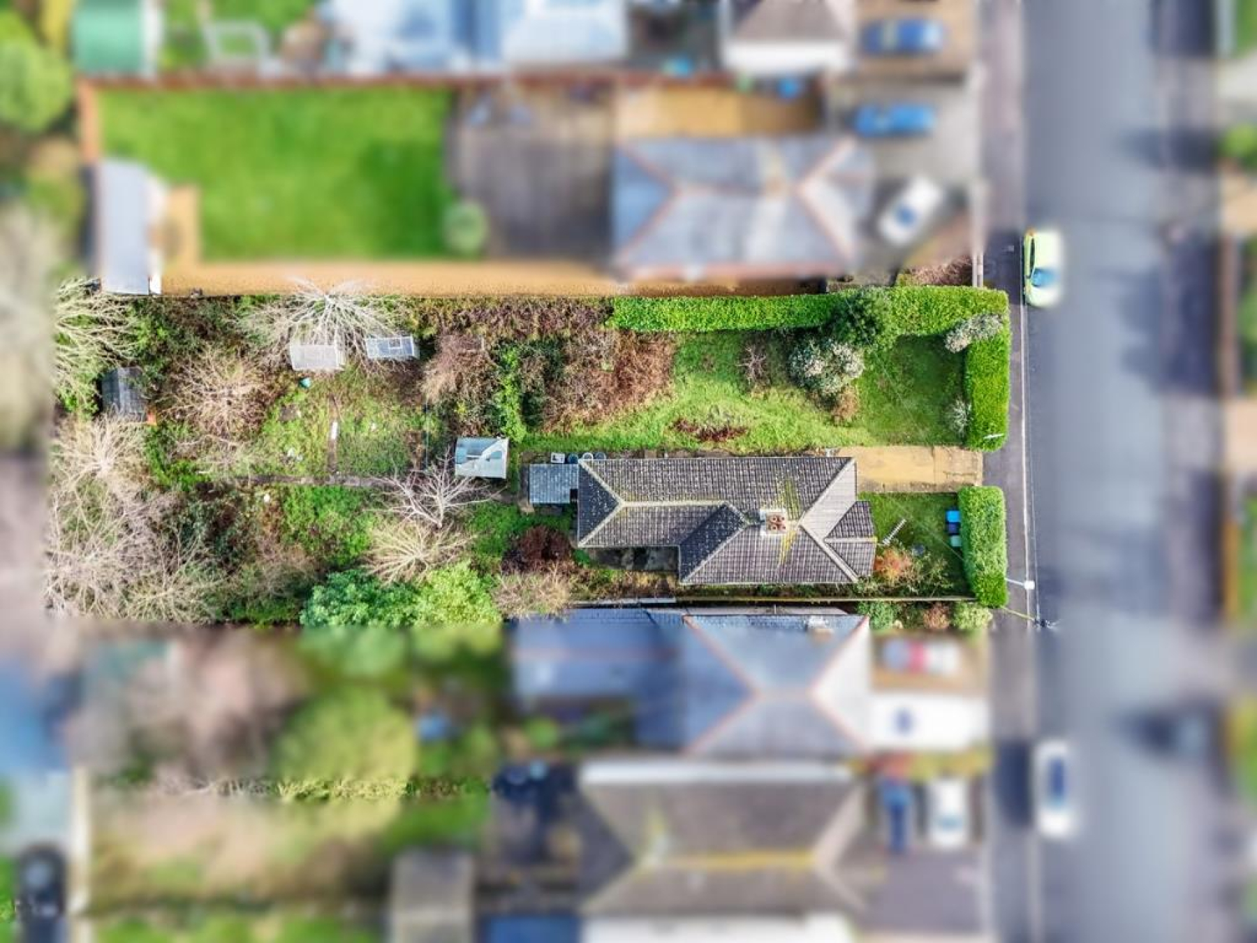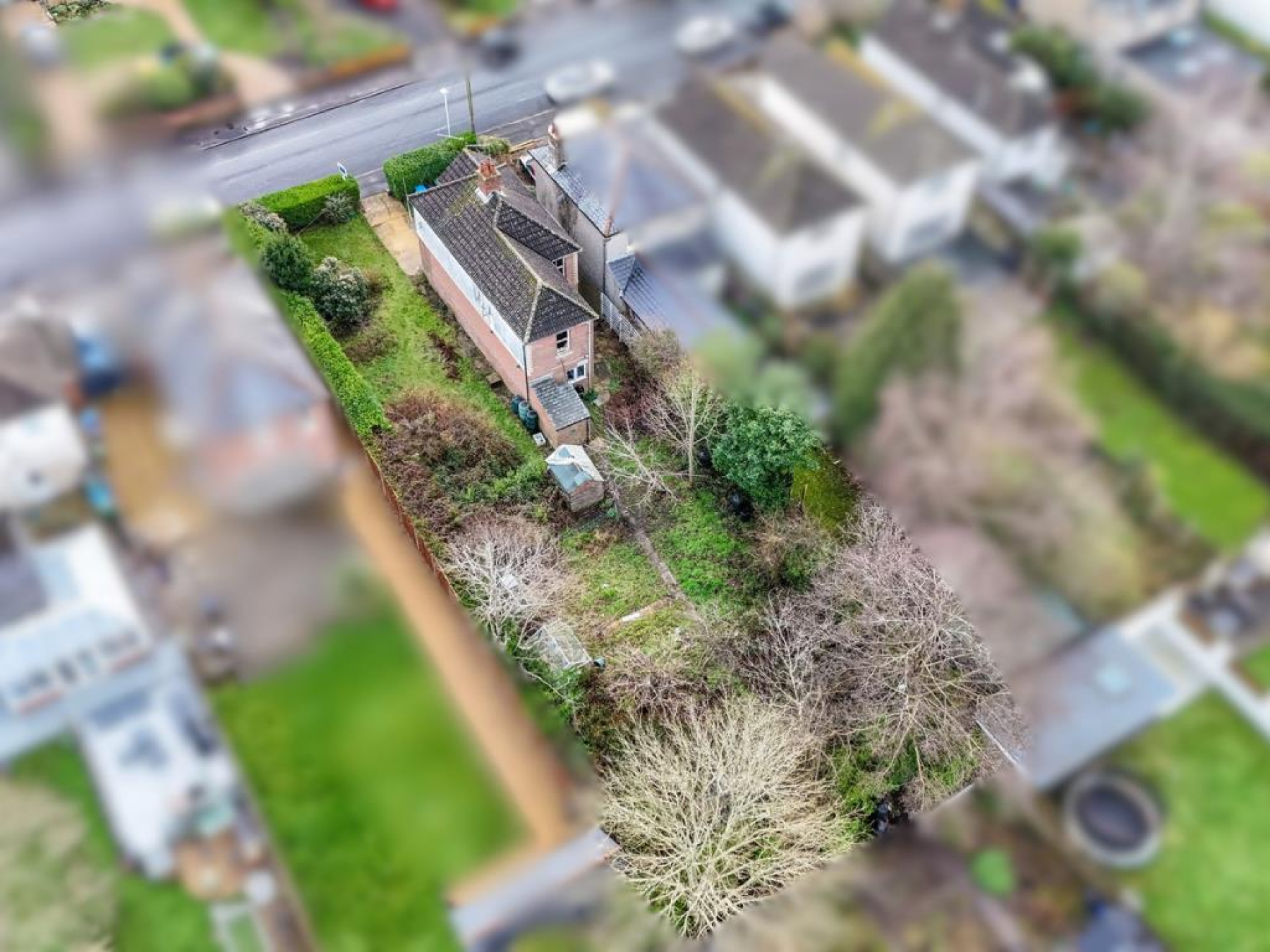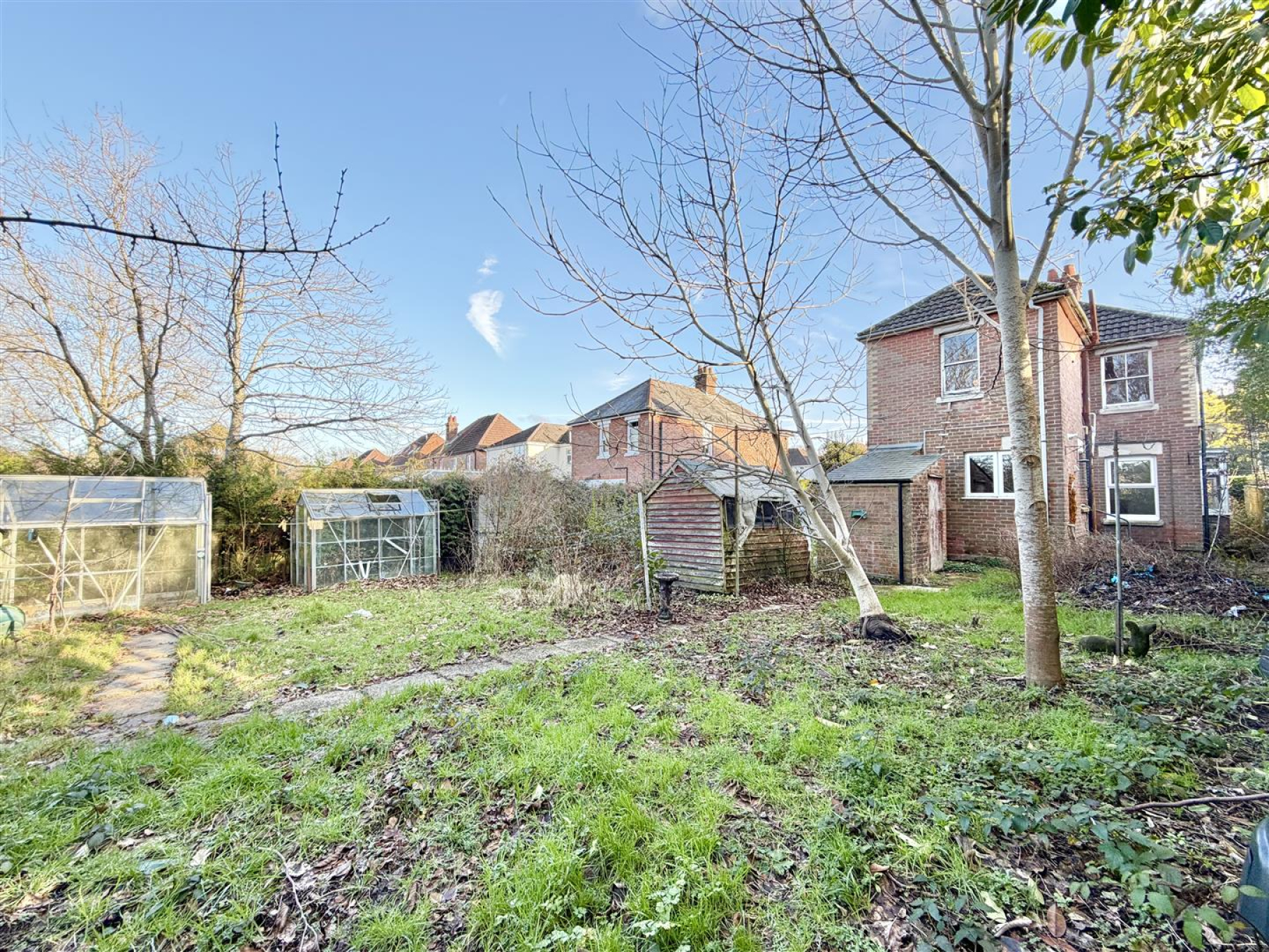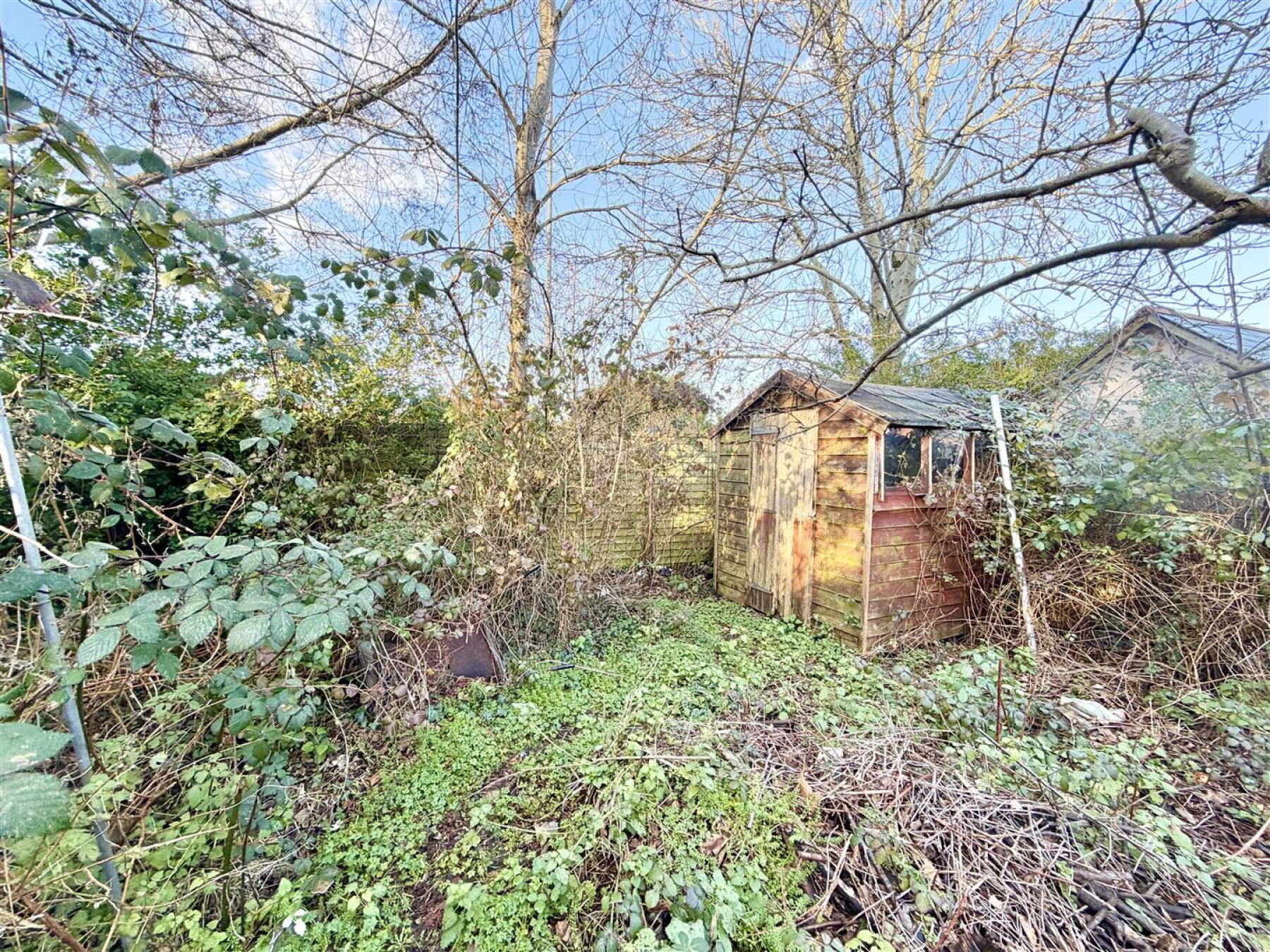 The gardens wrap around the property, with the side garden offering obvious development potential. The rear garden has become slightly overgrown and is enclosed by mature hedgerow with two garden sheds. The house is set back from the road, providing a degree of privacy with the front garden offering potential to create off road parking, subject to the necessary permissions and consents.