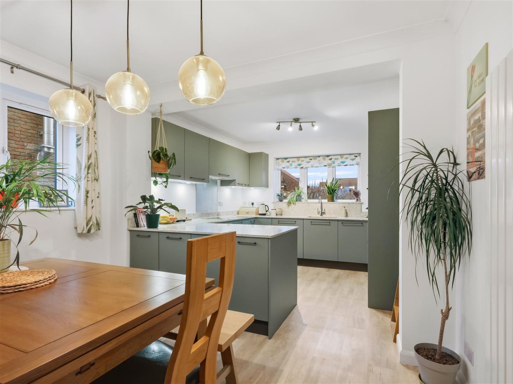 The kitchen diner features a modern kitchen with Konigstone Dakota quartz worktops, matching upstands and window cill, an integrated pop up power point and contemporary Italian units, with a defined dining area and a separate utility room.